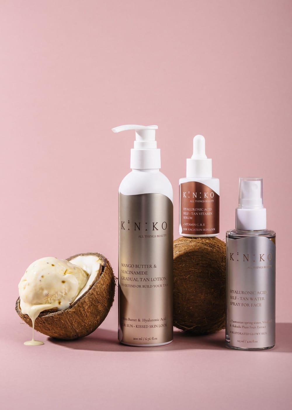 We’re redefining the glow with our self-tanning range—created to give you a flawless, healthy-looking tan without harmful UV exposure. Whether you want a soft, radiant finish or a deeper, tropical tan, the formula is streak-free and fast-drying. The KINIKO self-tanning line is enriched with skin-loving ingredients to help hydrate your skin while delivering an instant golden glow.